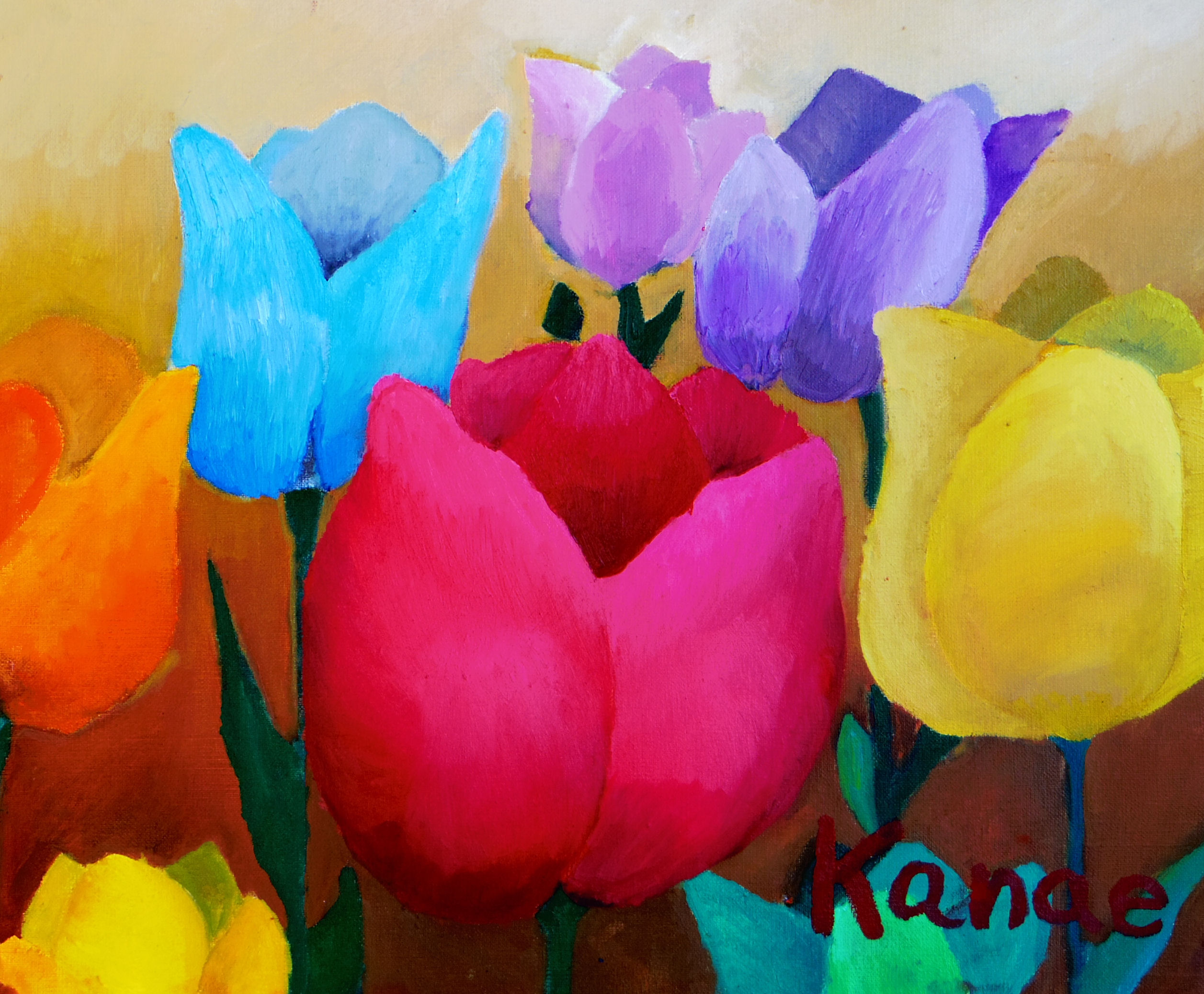 中学1年生のKさんが油彩F8号でチューリップを描きました。花を大きく赤、黄、紫で彩って楽しい絵になりましたね!