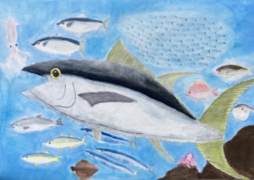 中学1年 SS君 大きいさかな小さいさかな、いろいろなさかながスイスイ泳いでいるところです。丁寧に描きましたね…