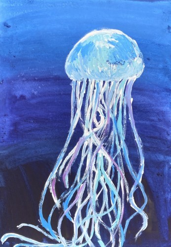 小学6年 SMさん 水彩絵の具で海を描き、アクリル絵の具でクラゲを描きました。フワフワを描くとき楽しそうに描い…